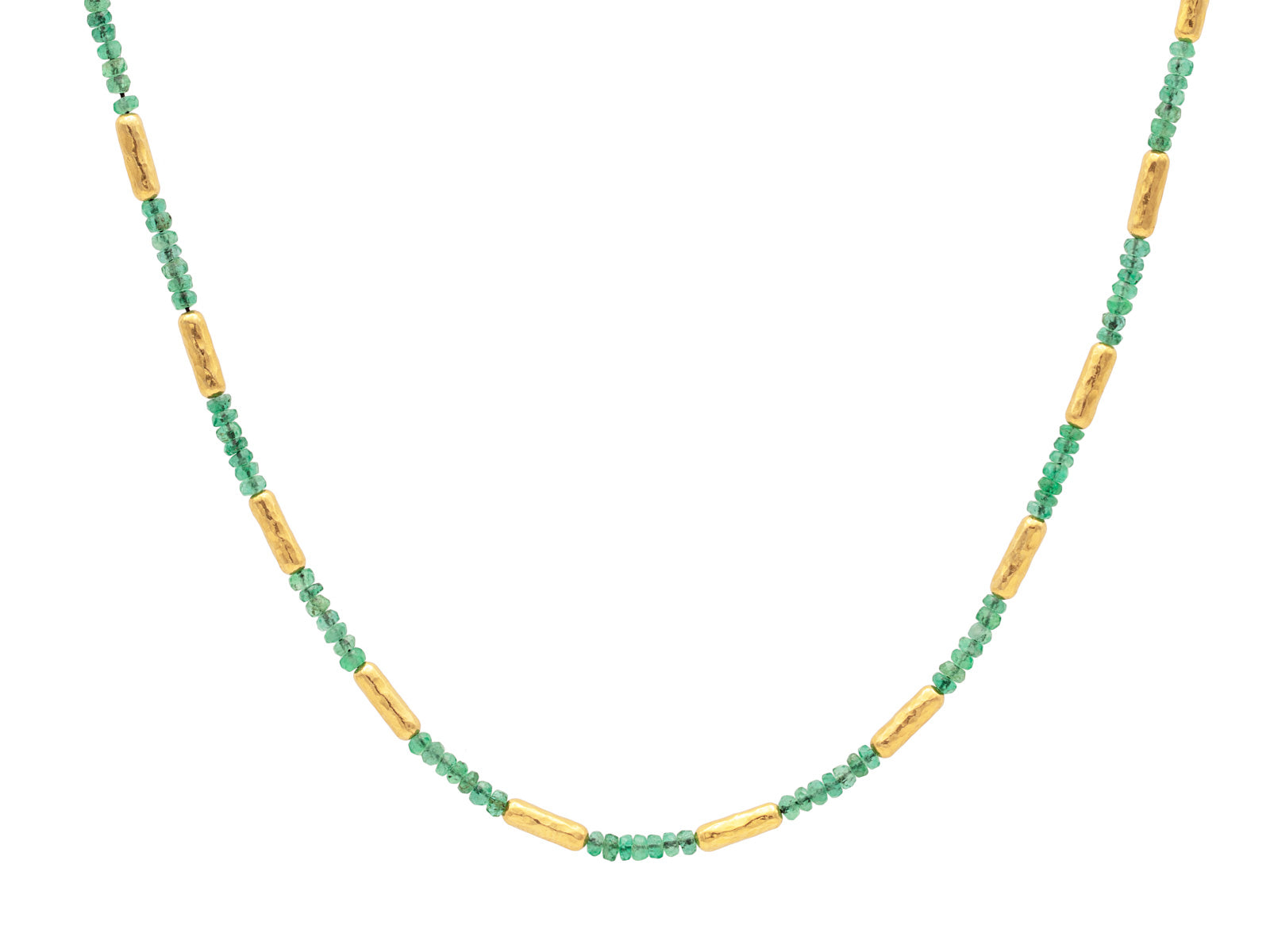 This exquisite 16" bracelet from the Vertigo collection showcases handcrafted 24K gold hammered tubes paired with faceted emerald beads totaling 8.45 carats. The knotted single-strand design is secured with an 18K gold lobster clasp, blending refined artistry with enduring elegance in a slender 2.5 mm width—an exceptional statement of timeless sophistication.