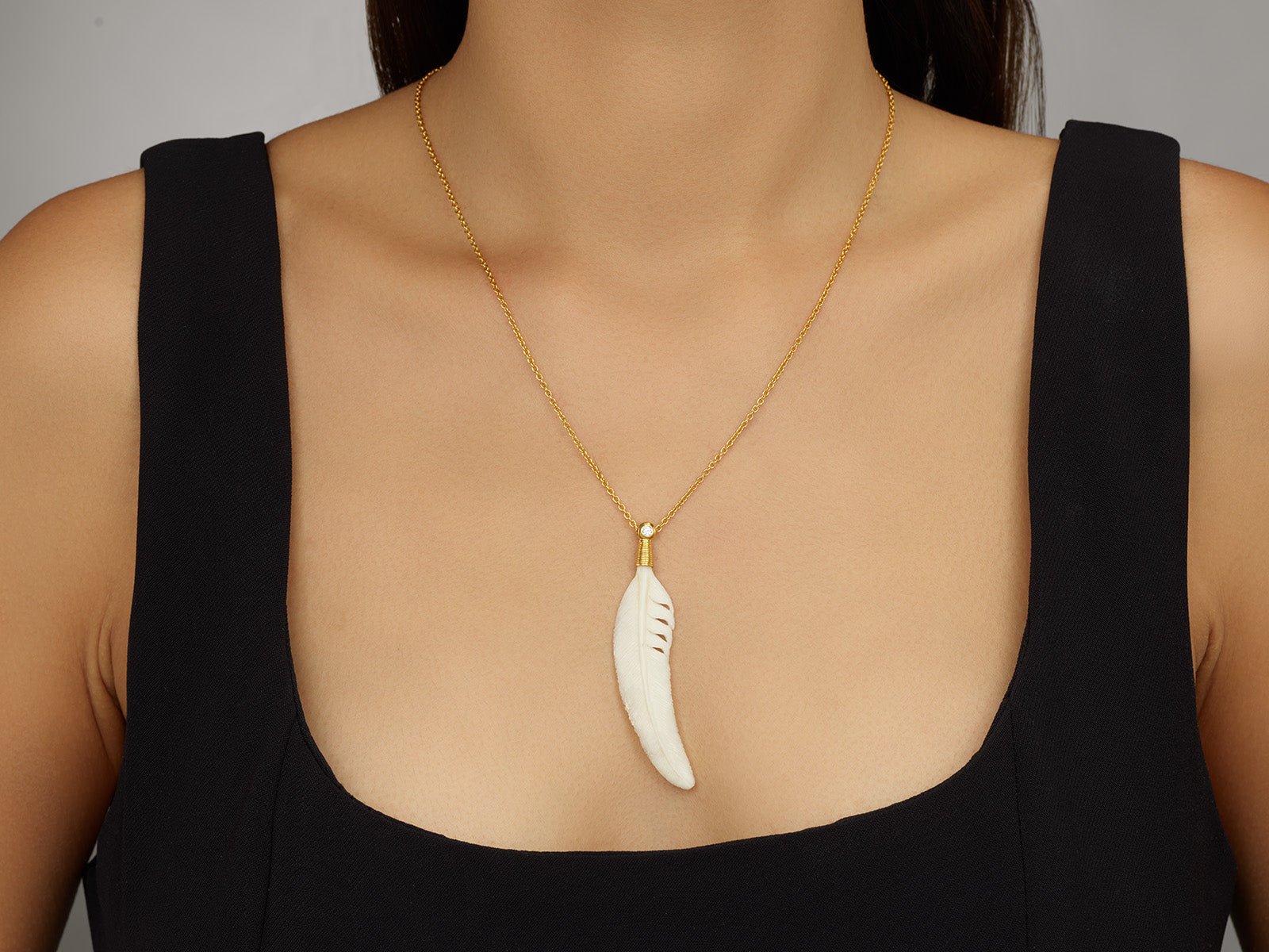 GURHAN Crown Gold Mammoth Tusk Pendant Necklace, 60x12mm Feather Shaped Carved Mammoth Tusk