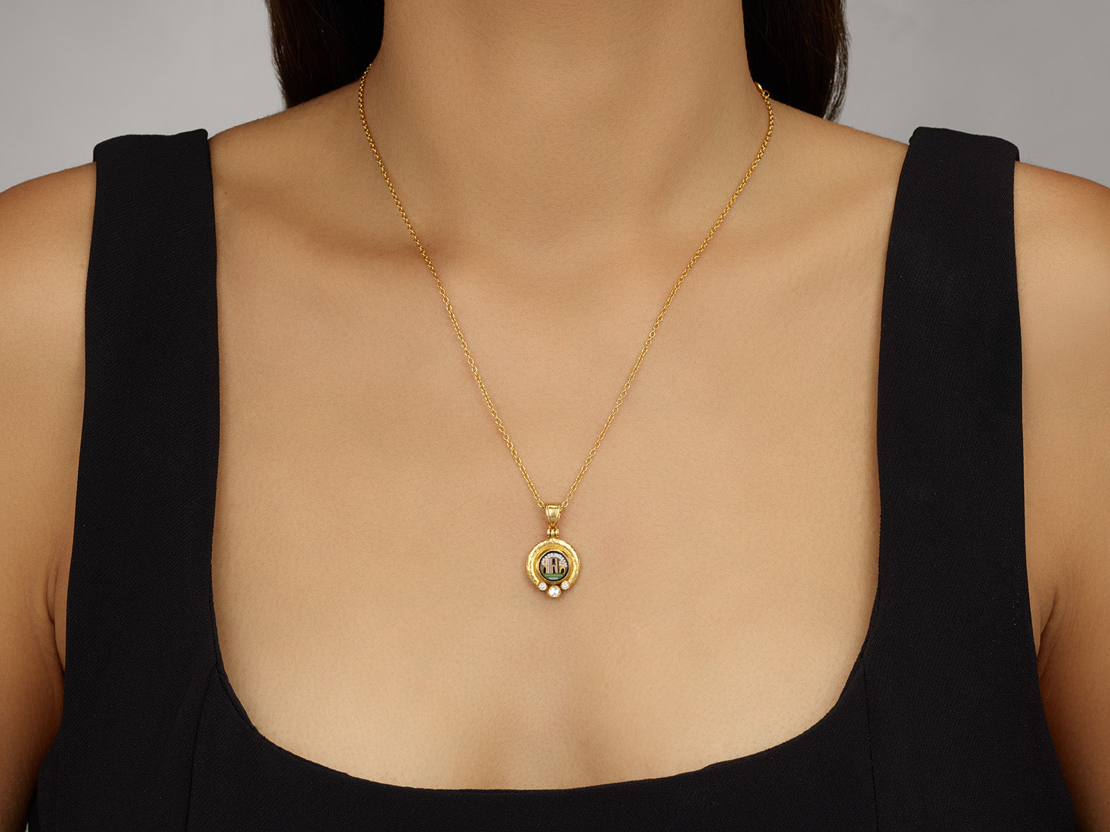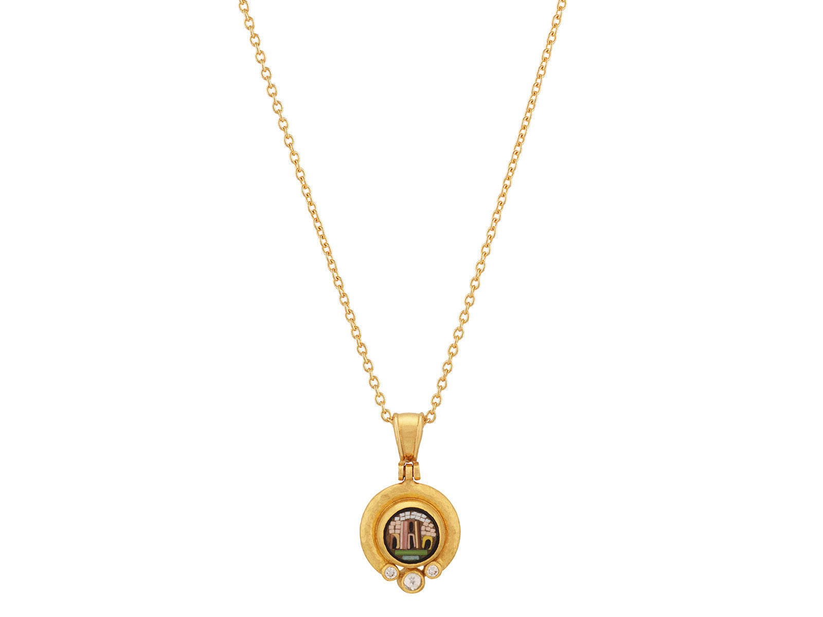 GURHAN Antiquities Gold Micro Mosaic Pendant Necklace, 9mm Round Micro Mosaic Depicting Roman Ruin