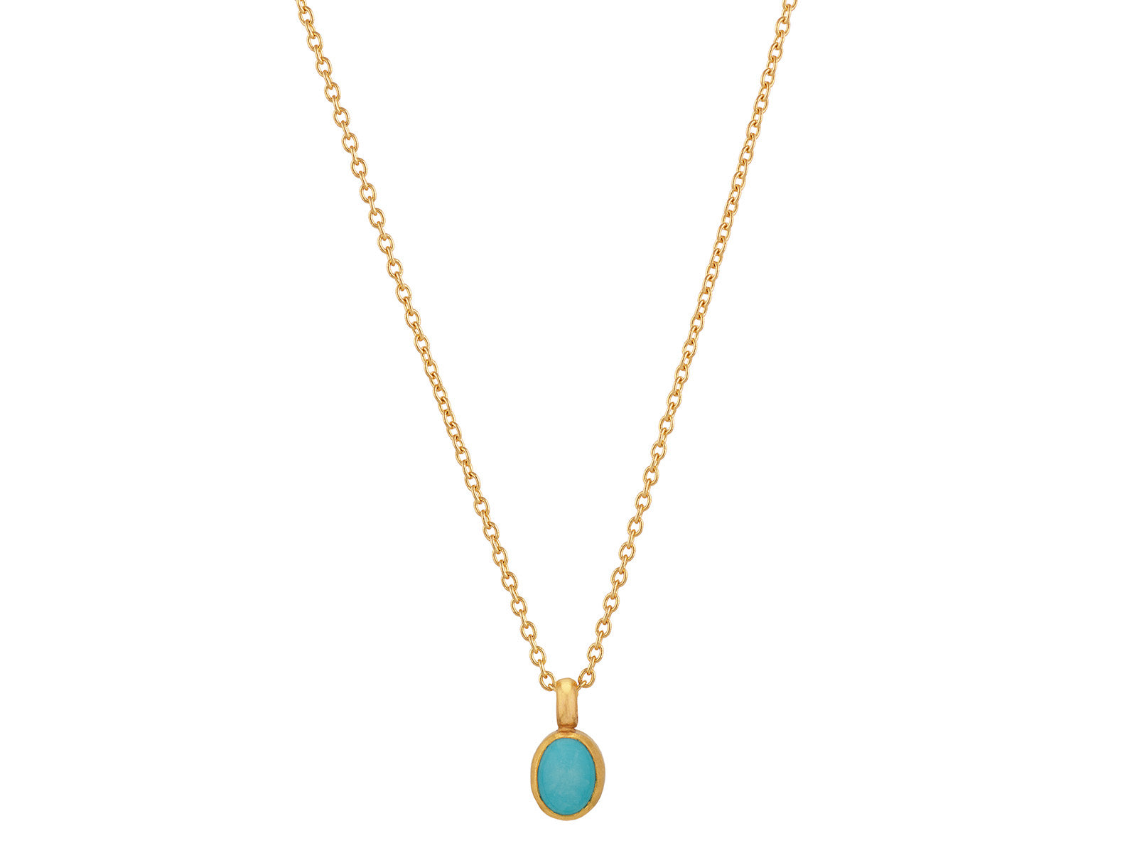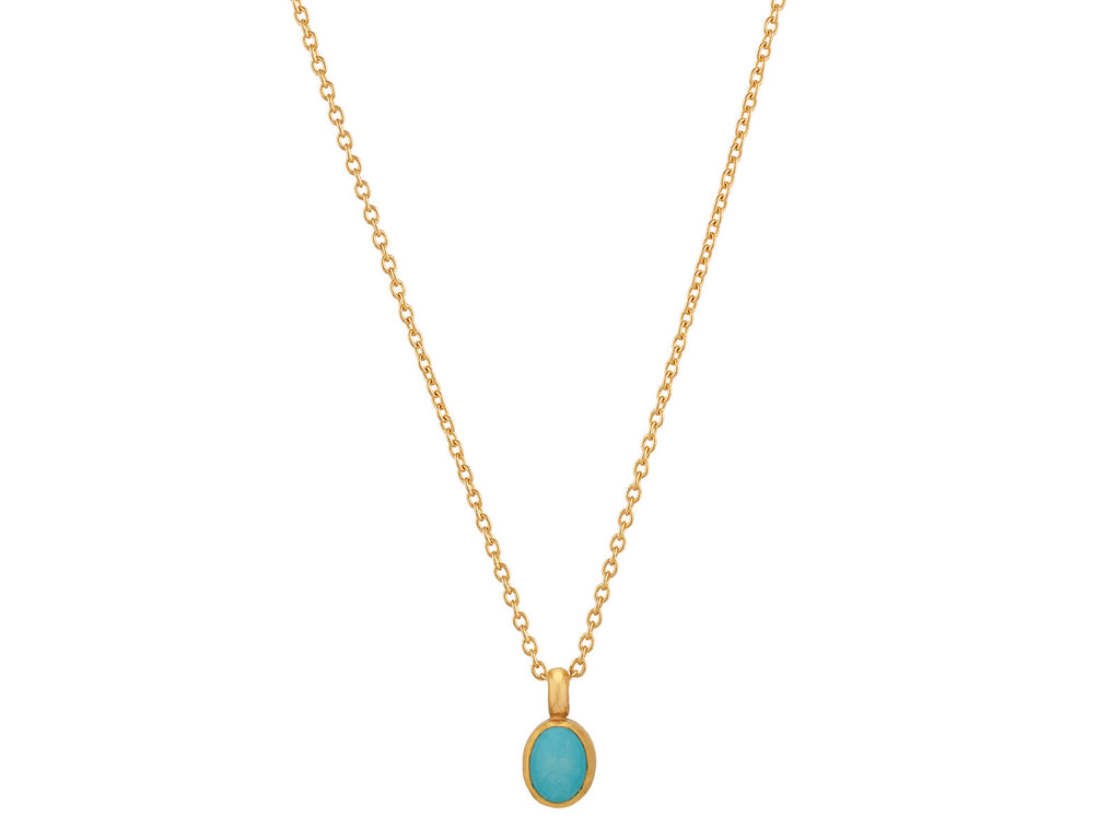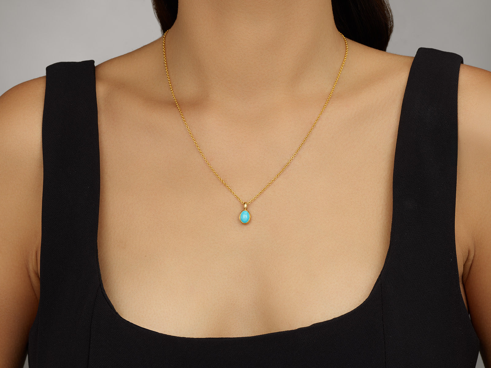 A radiant ode to the Rune collection, this one of a kind pendant centers an 8x6mm Sleeping Beauty turquoise cabochon in rich 24K gold. A 22K slider bale and adjustable 16–18" solid chain complete the design, elevating the stone’s serene color with timeless purity and refined craftsmanship.