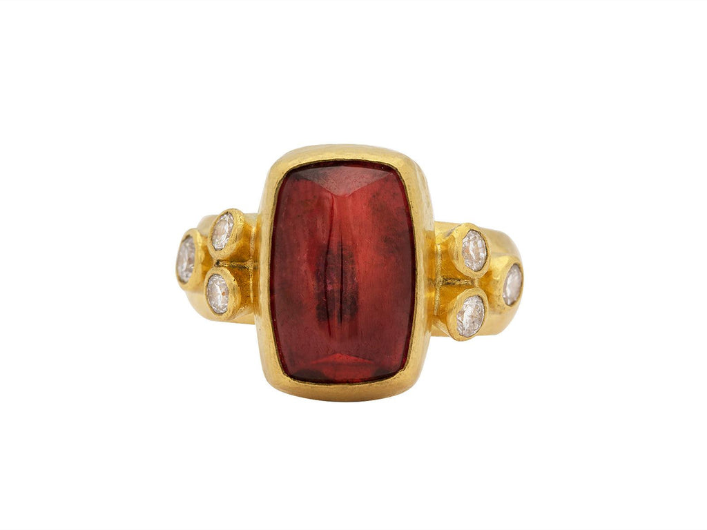 Experience the allure of our Rune Collection with this exquisite 24k Gold Cocktail Ring. Adorned with a mesmerizing 15x11mm rectangle cabochon pink tourmaline as its center stone, this one of a kind masterpiece is a true testament to artistry. The 24k gold bezel elegantly cradles the stone, while triple brilliant cut white diamonds add a dazzling touch, totaling 0.61 carats. The small graduated shank, Crafted in luxurious 24k gold, adds a touch of sophistication. With its vertical setting and size 6.5, this ring sits proudly at a height of 9.14mm off the finger, making it a remarkable statement piece. Embrace the unique beauty of this GURHAN creation and Indulge in pure luxury.